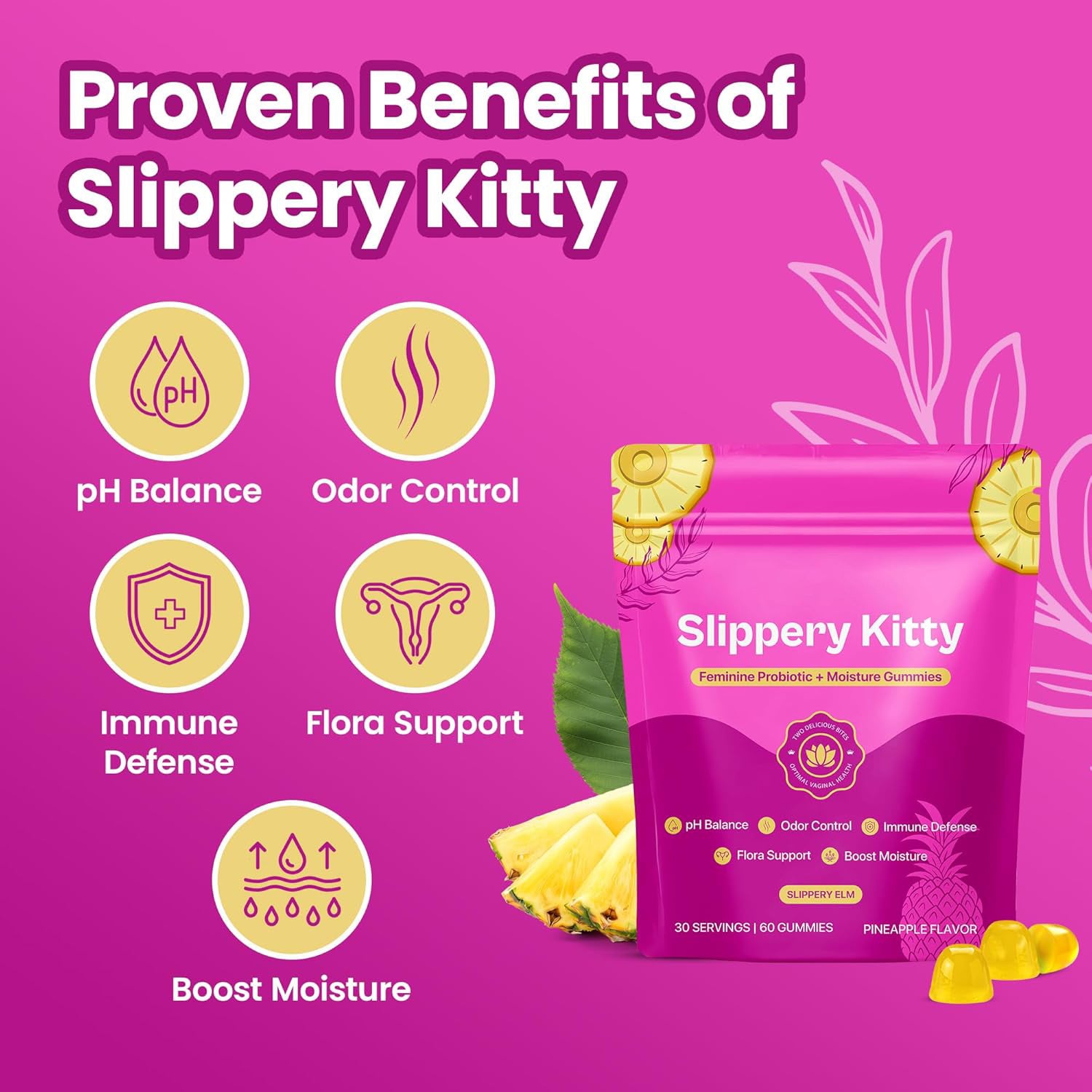 Enjoy 2 delicious pineapple gummies every day, at any time, with or without a meal. This convenient treat blends premium probiotics + Slippery Elm + Bacillus Coagulans for healthy vaginal odor, flora, moisture, and balance!